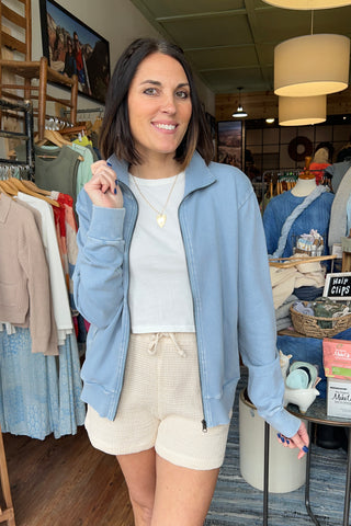 Faded Blue Stone Washed Terry Knit Zip Up Jacket