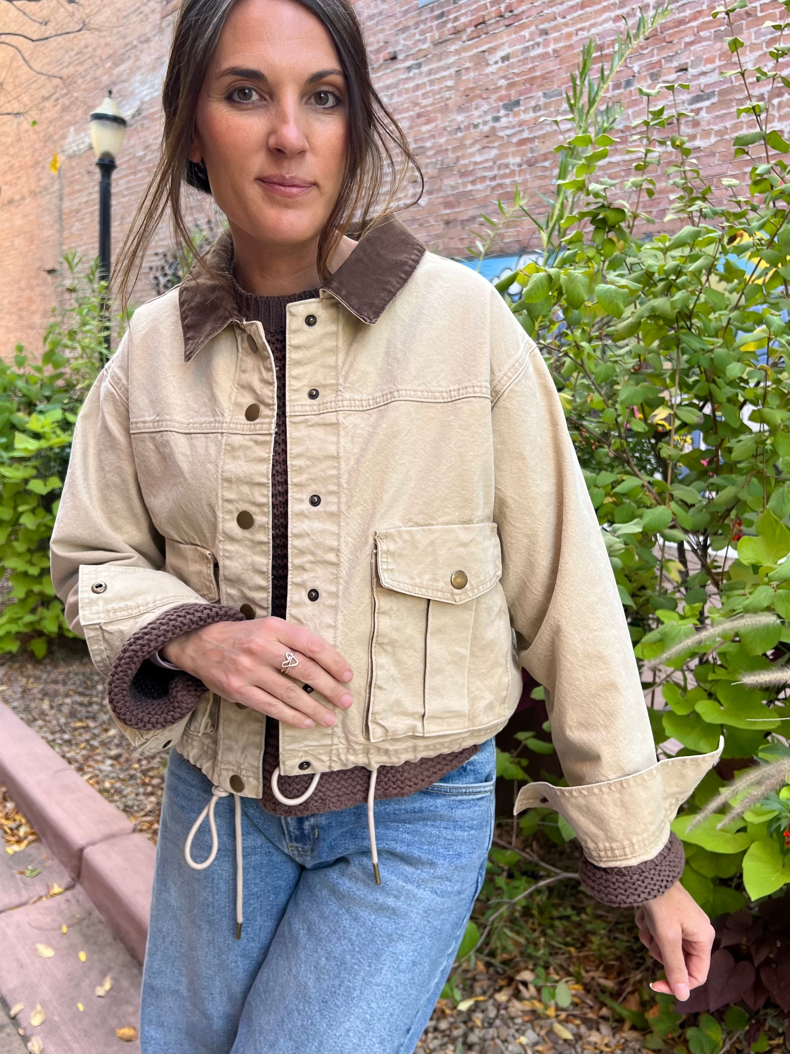 The Utility Jacket with a Barn Style design features a contrasting collar for a distinguished look. A mix of brown and beige denim with an updated take on the classic barn jacket.