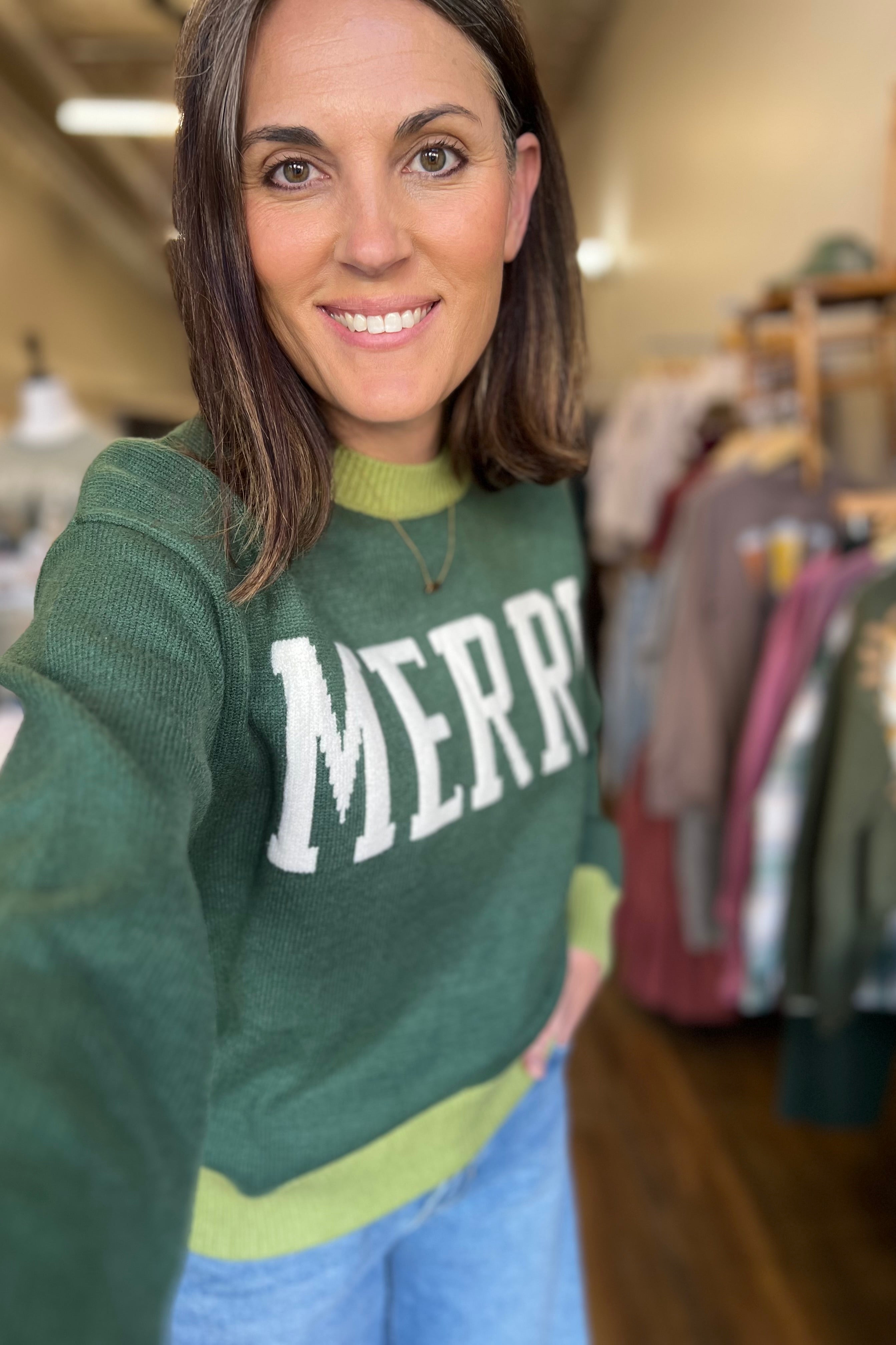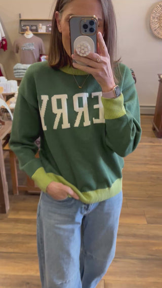 Spread holiday cheer in this vibrant green crew neck sweater, featuring a cheerful "MERRY" message that captures the spirit of the season. Perfect for festive gatherings, casual outings, or cozy nights in, this playful knit brings warmth and joy to your winter wardrobe. The classic crew neckline offers timeless style, while the bold graphic makes a fun statement that's sure to get smiles wherever you go.
