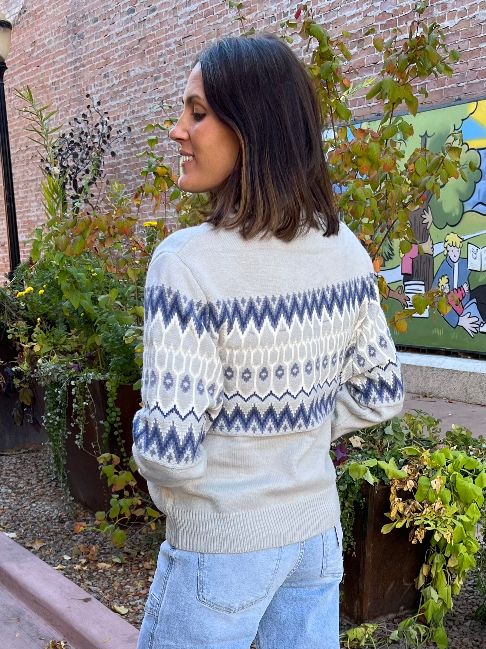 + Fair isle zip up sweater cardigan + Ribbed stand collar + Double slide zipper closure + Long sleeves with ribbed knit cuff + Front pockets