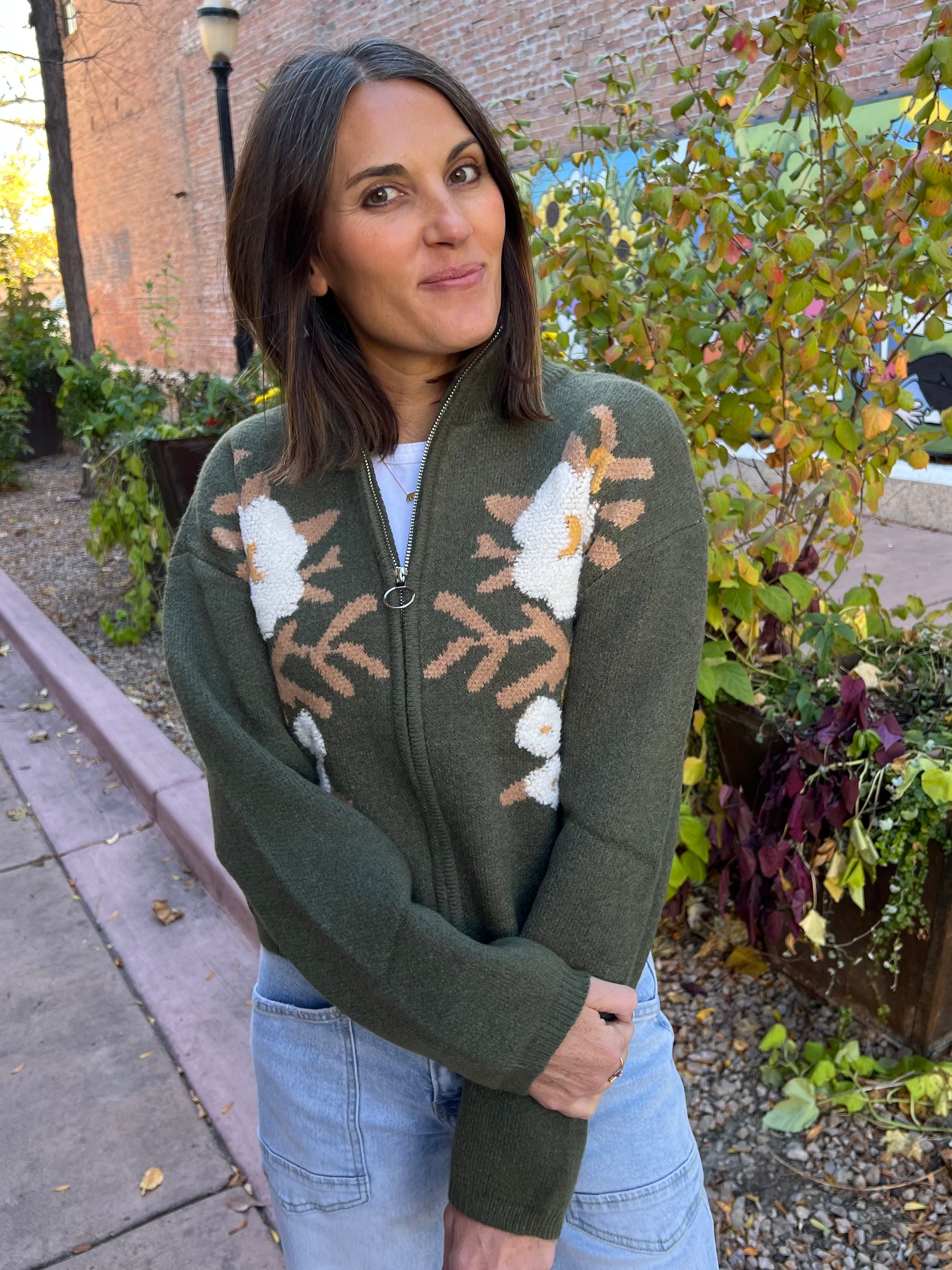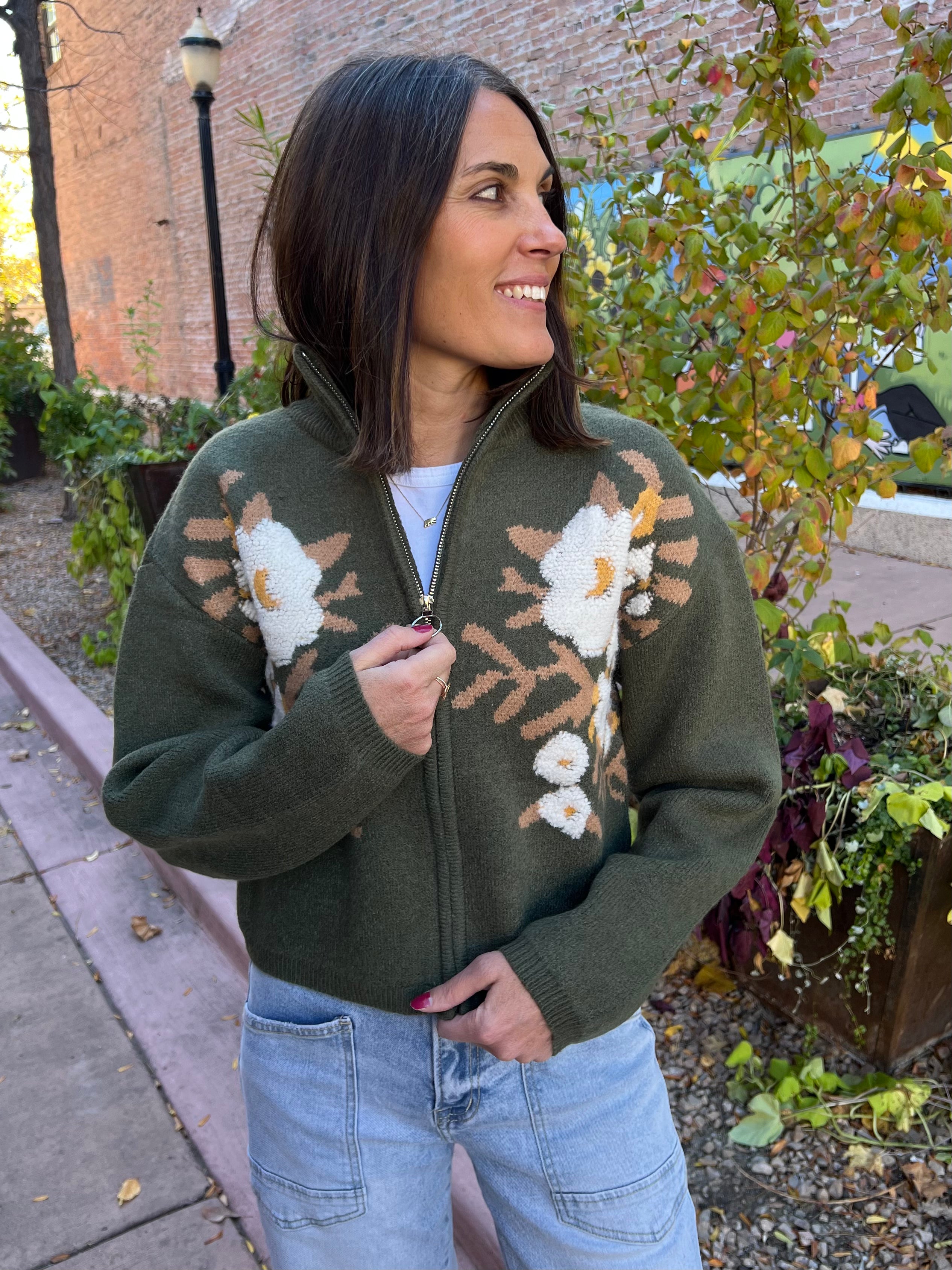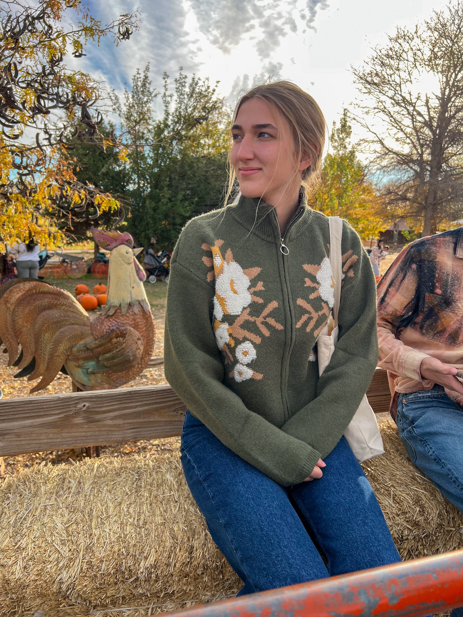 This sophisticated cardigan features a charming floral pattern paired with thoughtful design details. The ribbed stand collar frames the neckline while the full-length zipper allows for easy layering and temperature control. Relaxed drop shoulders and voluminous puff sleeves create an on-trend silhouette, finished with ribbed knit cuffs and hem for a polished, structured look that holds its shape beautifully.