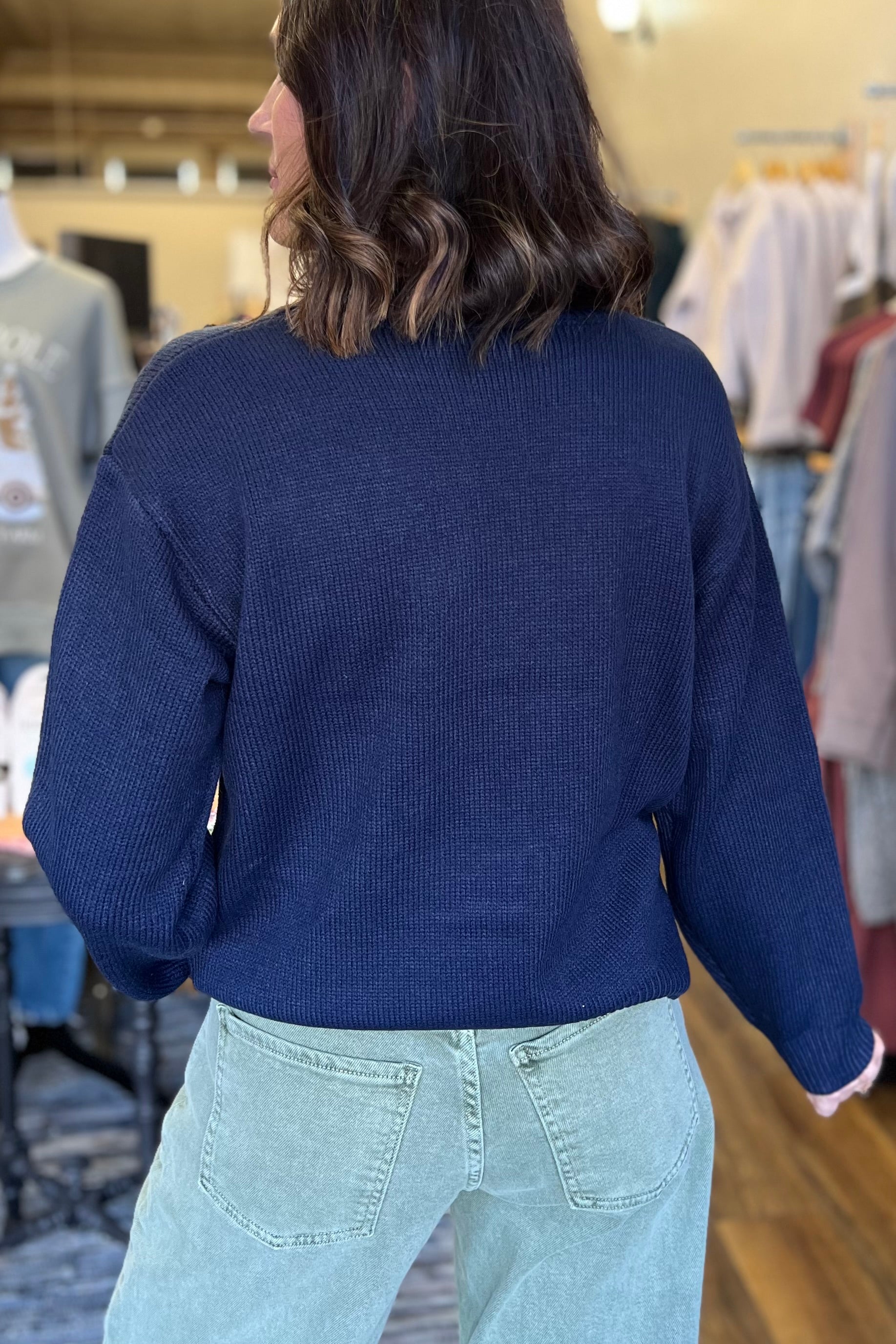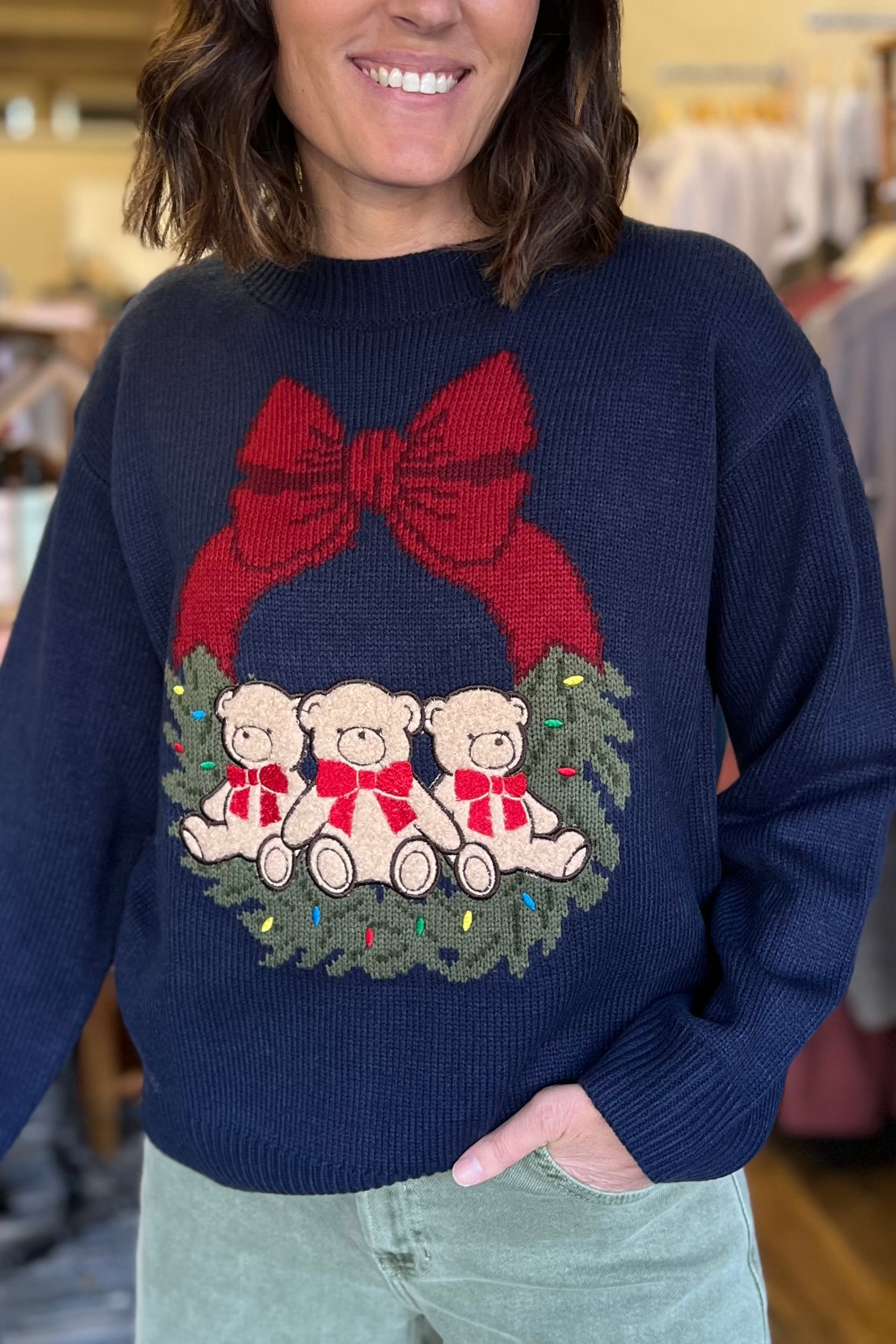 Wrap yourself in holiday cheer with this cozy navy sweater featuring an adorable teddy bear nestled within a festive Christmas wreath design. Perfect for spreading seasonal joy, this playful piece combines comfort with whimsical charm. Whether you're decorating, caroling, or simply enjoying hot cocoa by the fire, this sweater brings warmth and personality to your winter wardrobe. A delightful choice for anyone who loves mixing cuddly vibes with festive flair.