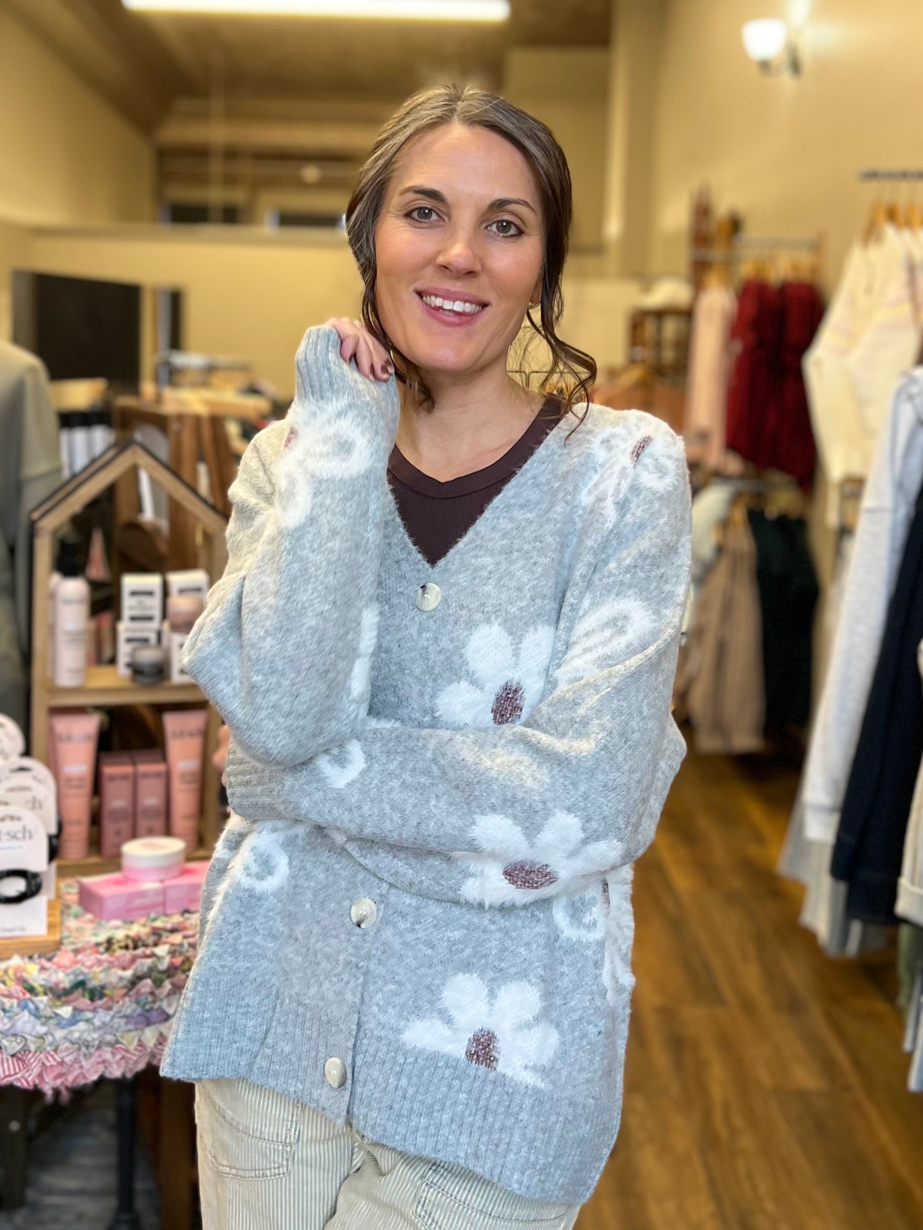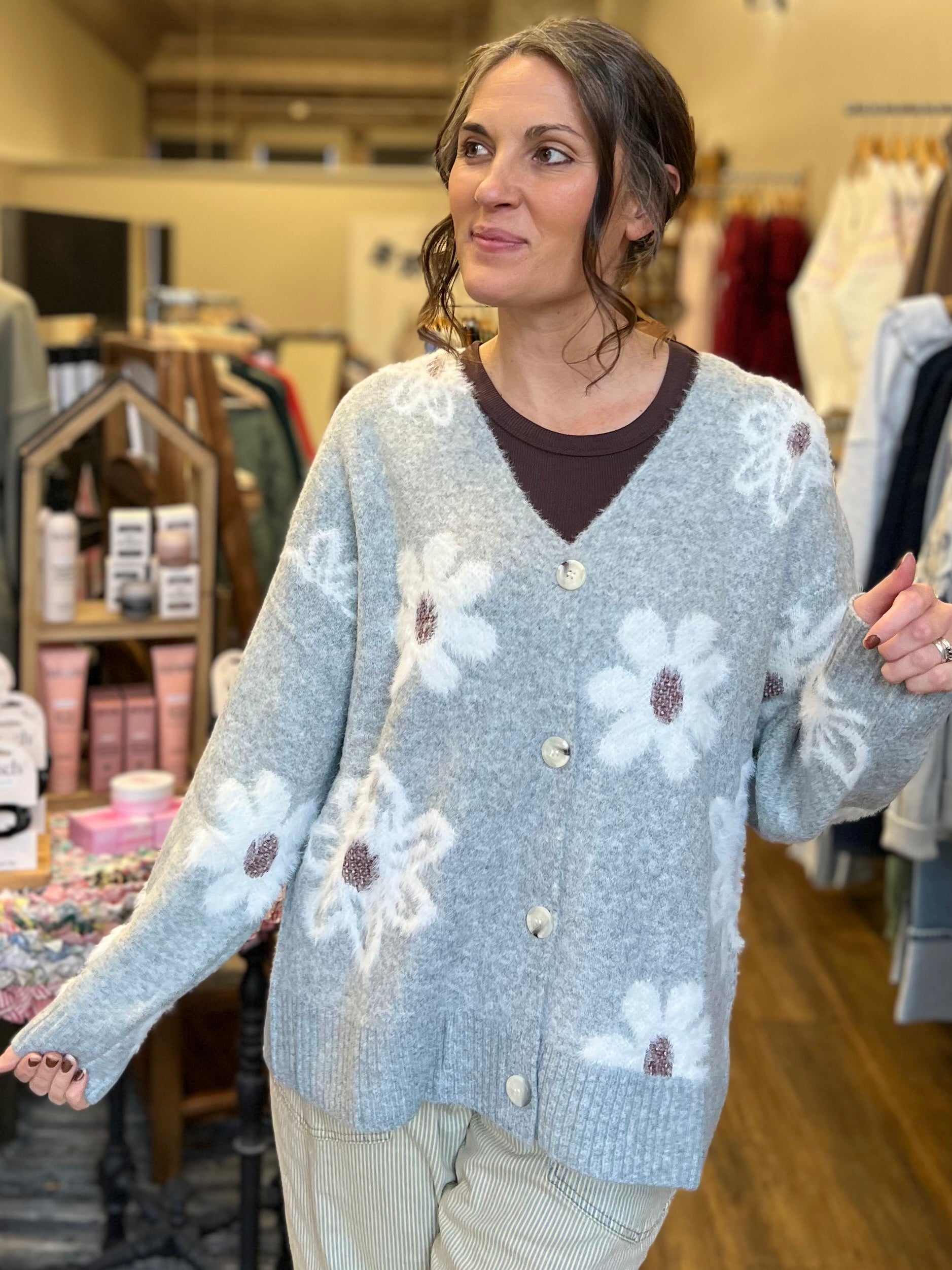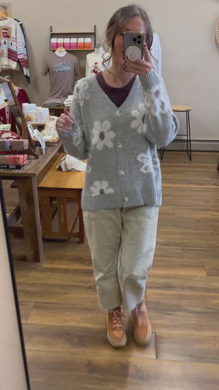 Snuggle up with this cozy floral cardigan, a must-have for those cooler days. Its loose fit makes it easy to layer, making it a versatile piece for any outfit. Rock it with jeans for a laid-back vibe, or dress it up with tailored pants for a chic touch. Whether it's fall or winter, this sweater is the perfect addition to your wardrobe - pair it with a stylish coat for extra warmth without sacrificing fashion.
