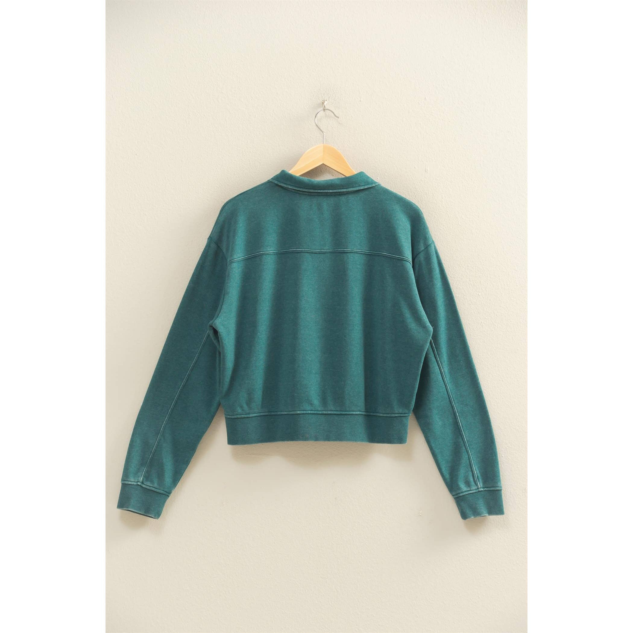 This pullover is crafted from burnout washed french terry, giving the fabric a soft, lived-in texture. The design features a high stand collar neckline with a convenient half-zip closure, and long drop-shoulder sleeves with traditional ribbed cuffs. It is a relaxed, slightly cropped fit. Pair this piece with matching fleece joggers for a casual look.