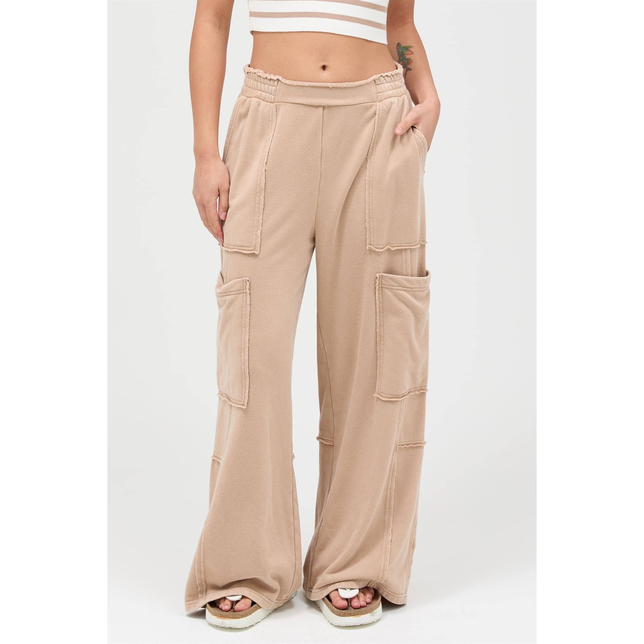 Crafted from soft fabric, these trend-forward cargo pants feature a high-rise elasticated waistband with a raw edge finish, multiple raw-edge patch pockets, and a dramatic wide-leg silhouette that drapes to the floor. Pair with a fitted crop top and platform sandals for an effortlessly chic and stylish ensemble.