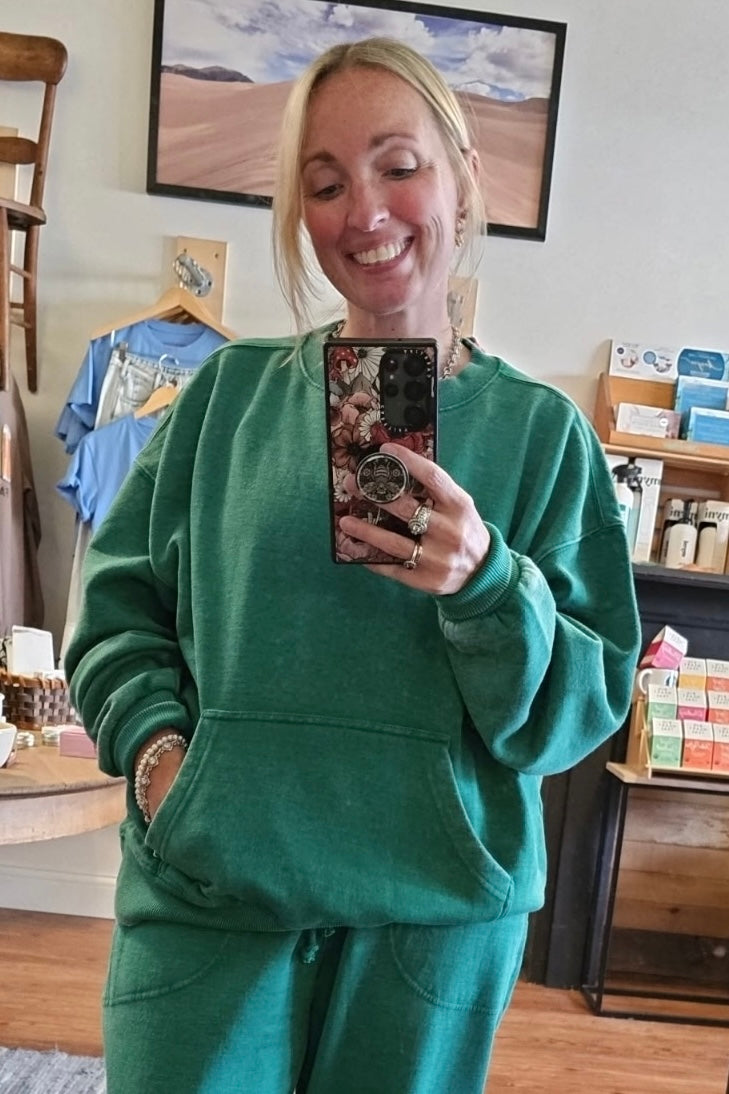 Features: Comfy cotton blend, drop-shoulder long sleeves, crew neckline, kangaroo pocket