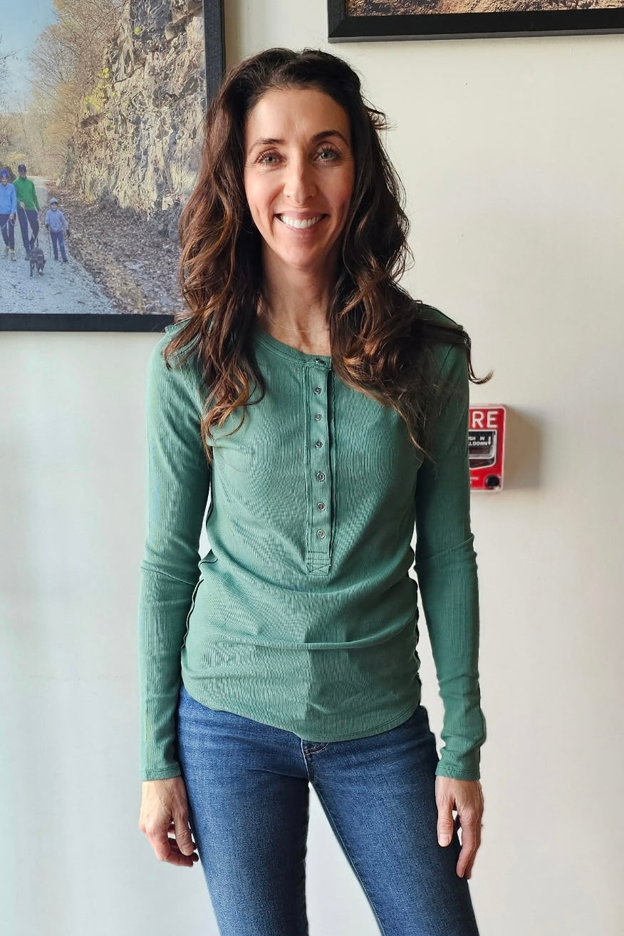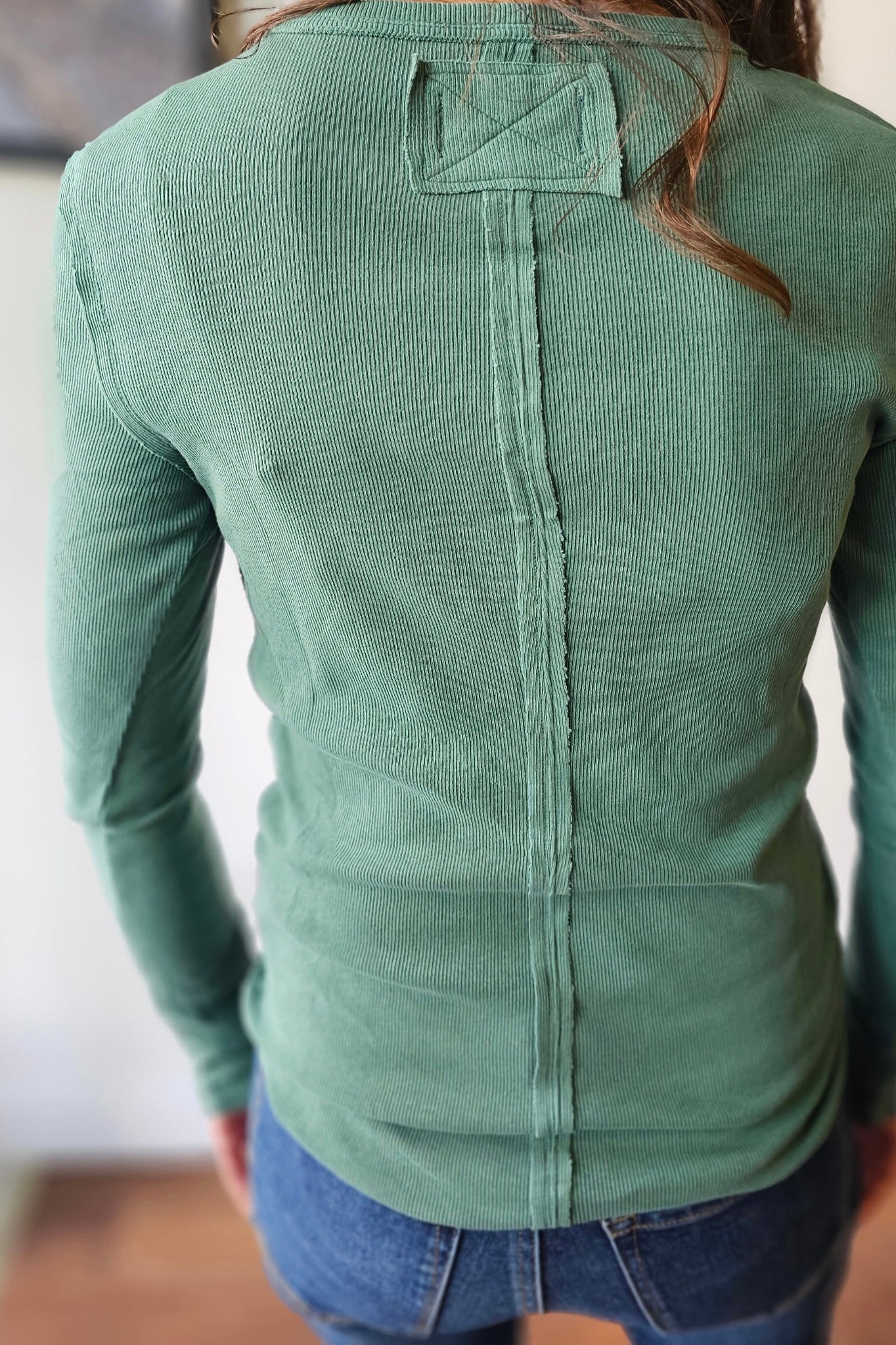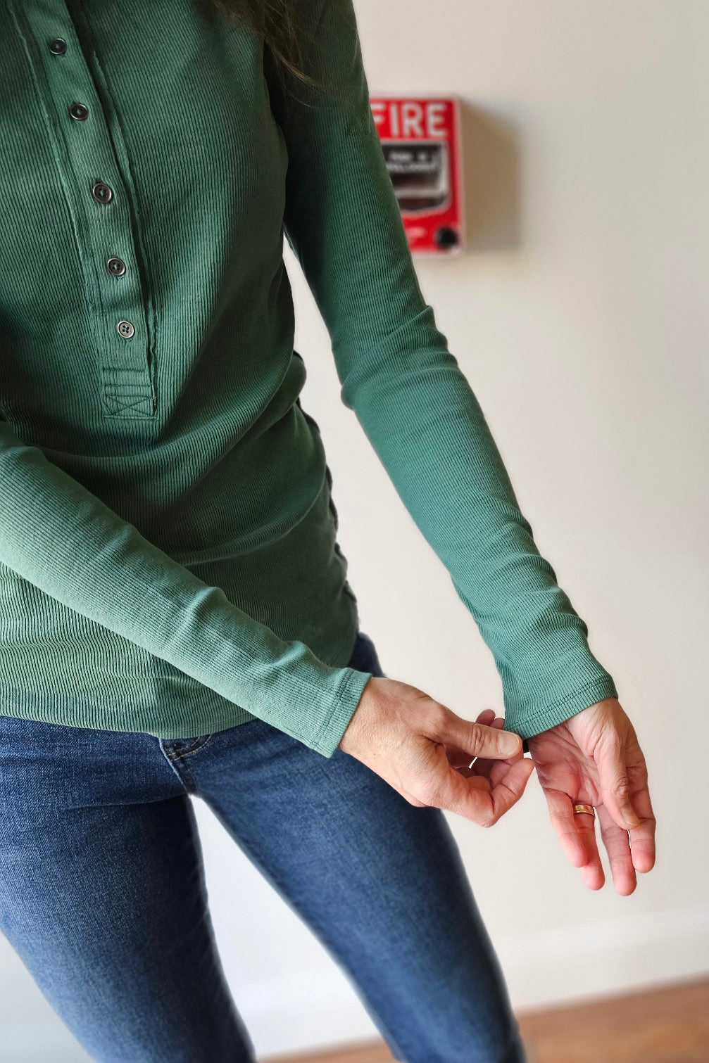 Features: Soft cotton fabrication with a stretchy feel, henley-style with button closures, fitted long-sleeves, exposed seam detailing, round hemline