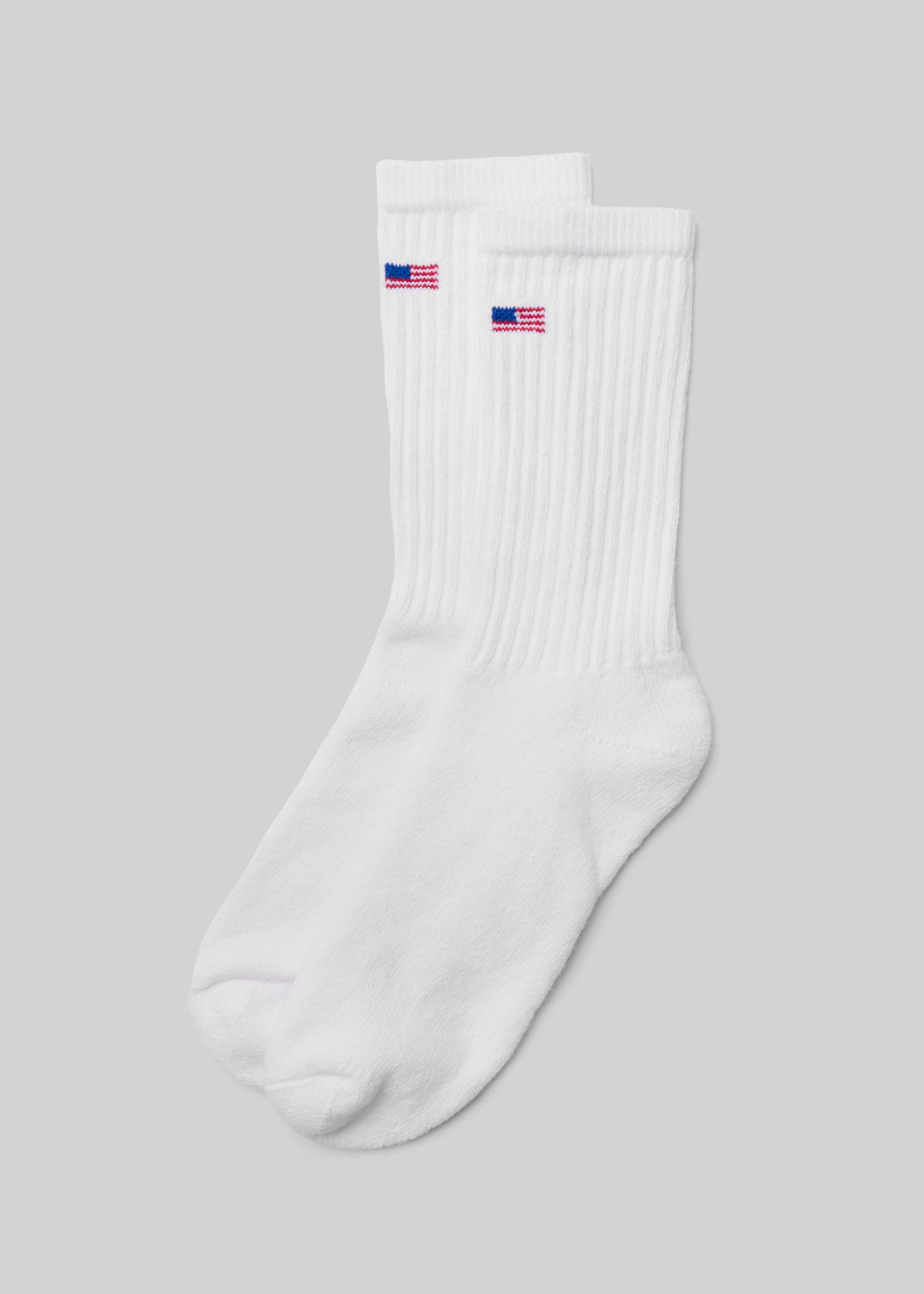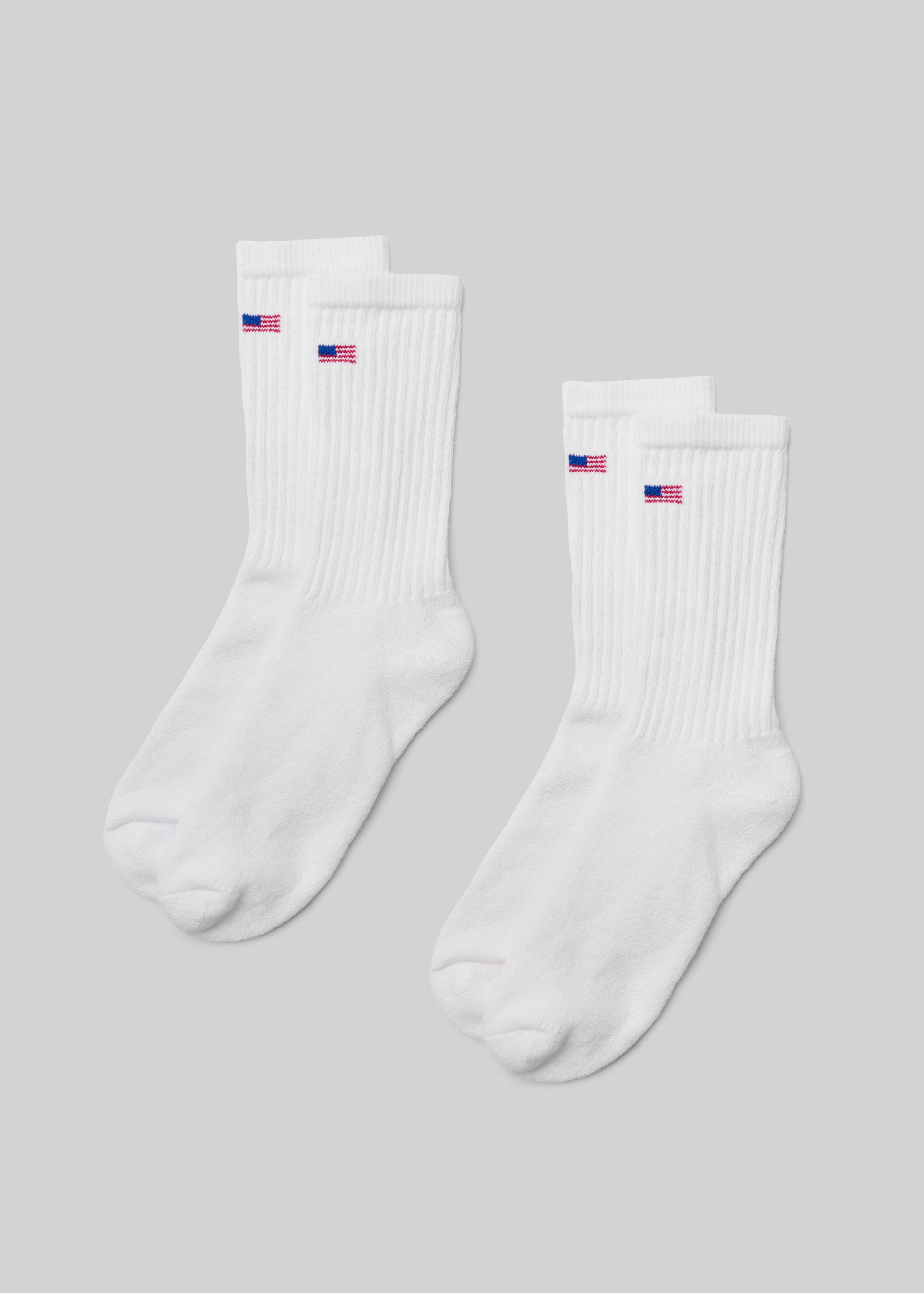 As a made-in-America brand, it's only right that we present a product to celebrate the story of American manufacturing. The Flag Crew is available as a 2-pack in limited quantities, this white crew is a bit longer than our standard Retros with an intarsia-knit flag and full-cushioned terry footbed.