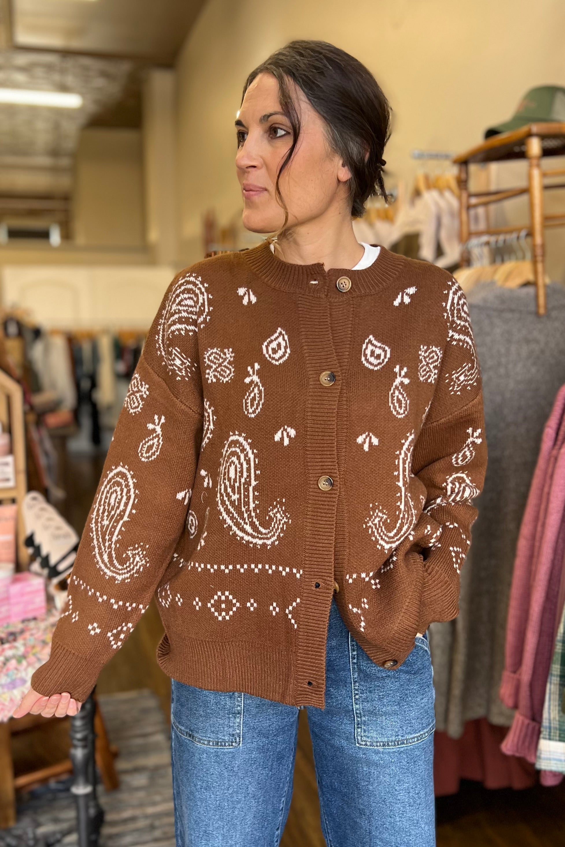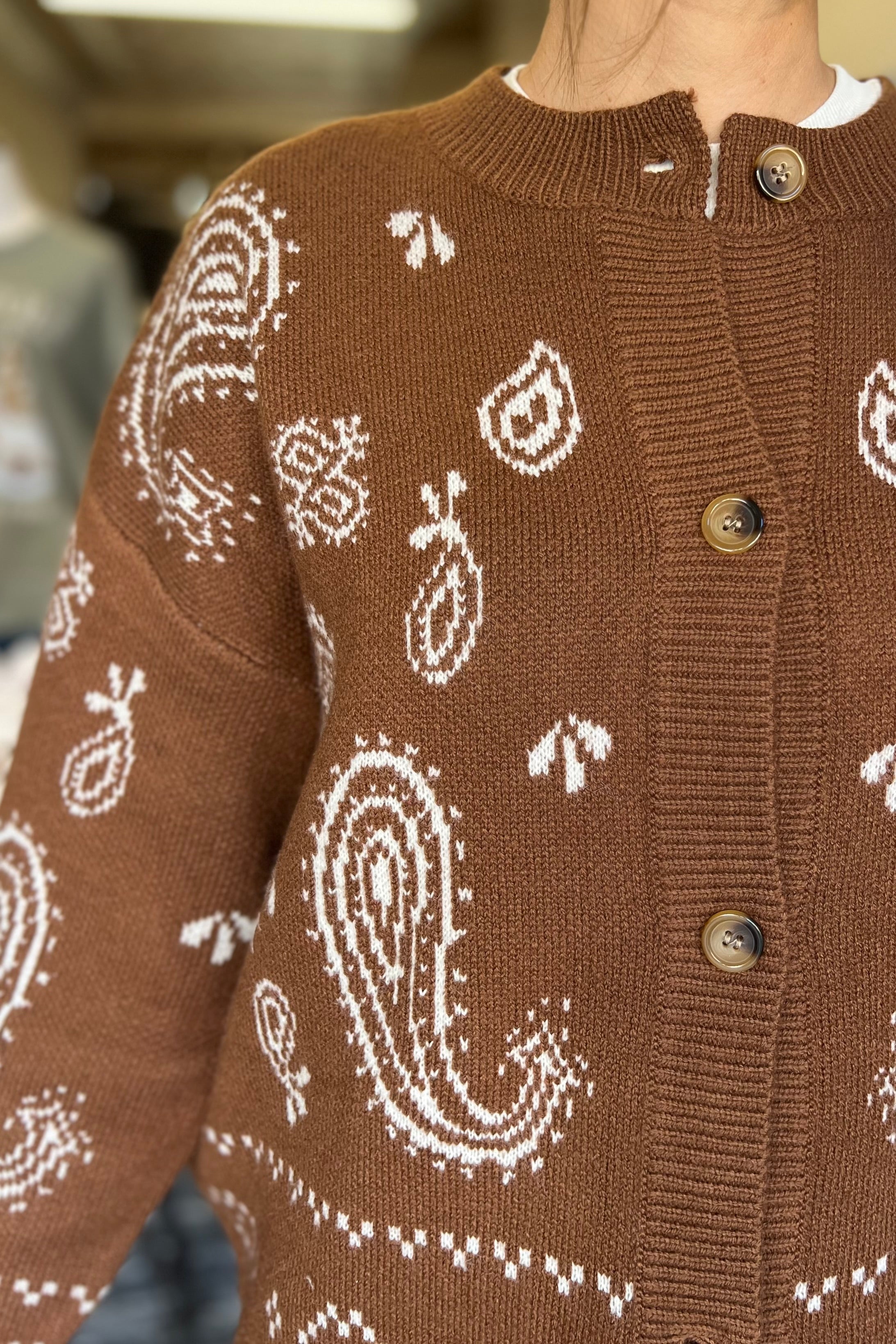 This sophisticated cardigan features a timeless paisley motif rendered in rich brown tones. The long sleeves and classic crew neck design offer versatile layering for any wardrobe. Crafted with attention to detail, this piece combines traditional pattern work with contemporary styling, making it an essential addition for those who appreciate refined, enduring fashion.
