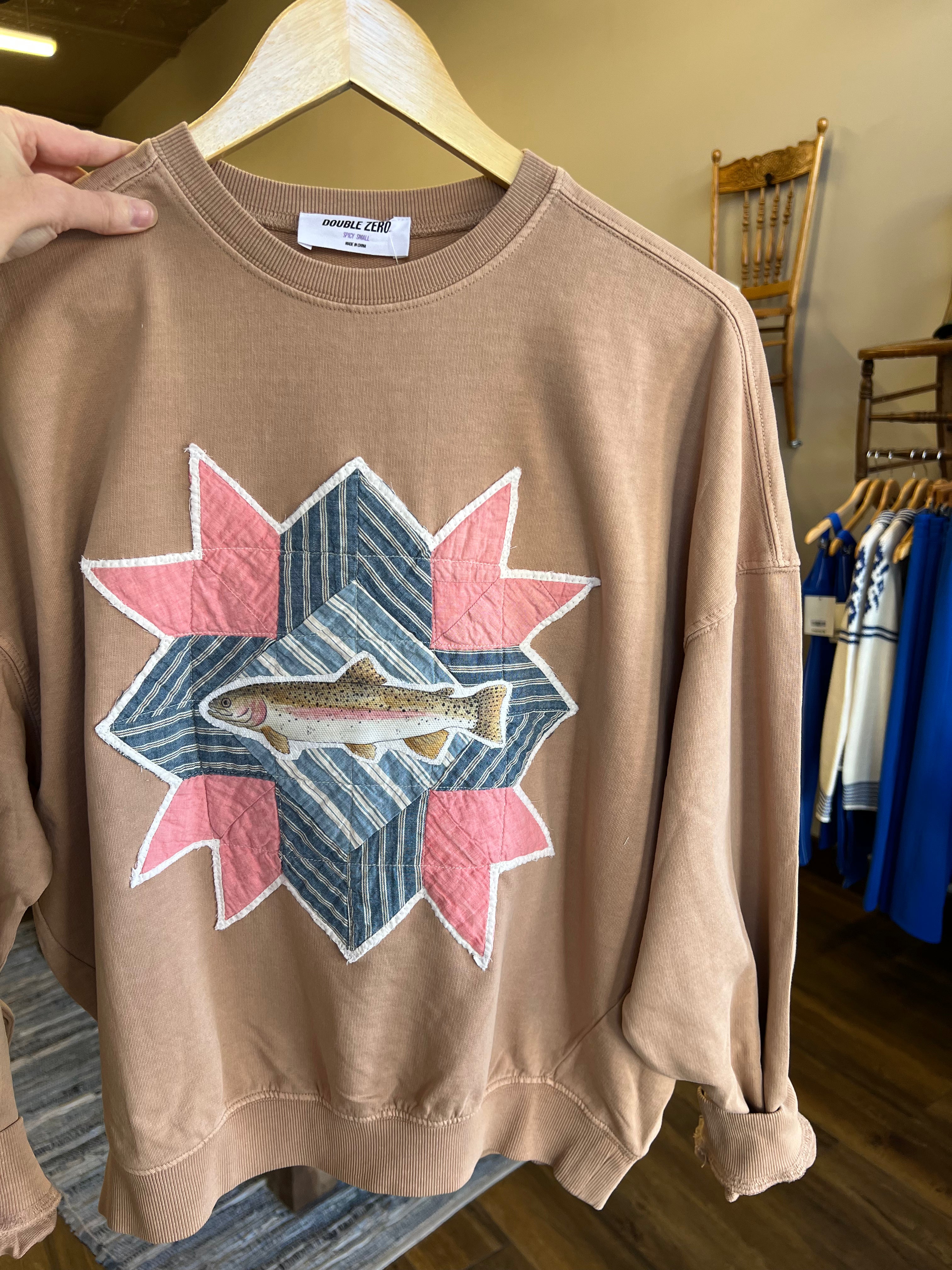 Vintage Quilt Piece with Rainbow Trout Crew Neck Sweatshirt