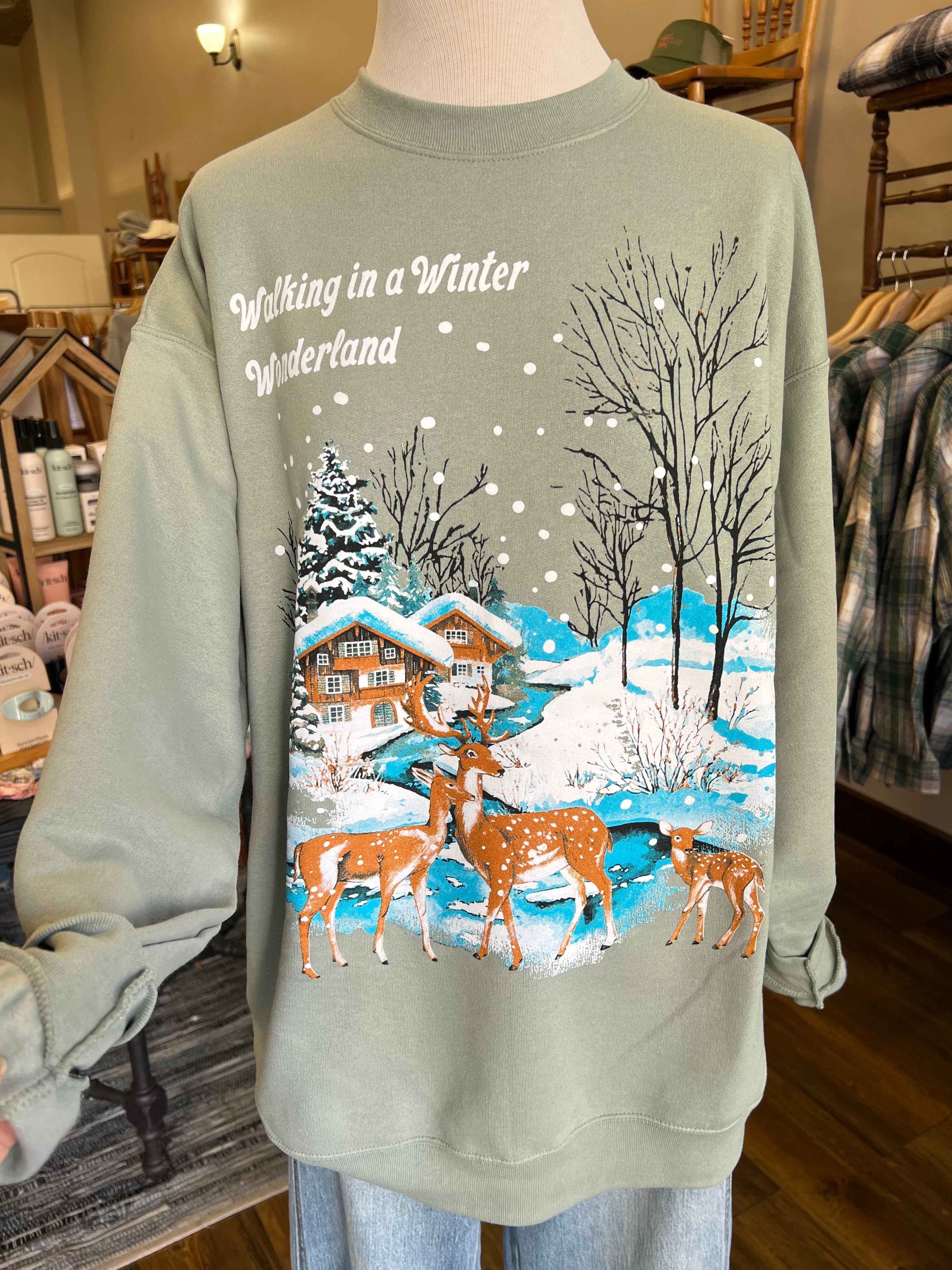 This oversized sweatshirt features a long-sleeve crew neck design with a festive "Walking in a Winter Wonderland" graphic, perfect for celebrating the holiday season with cozy comfort.